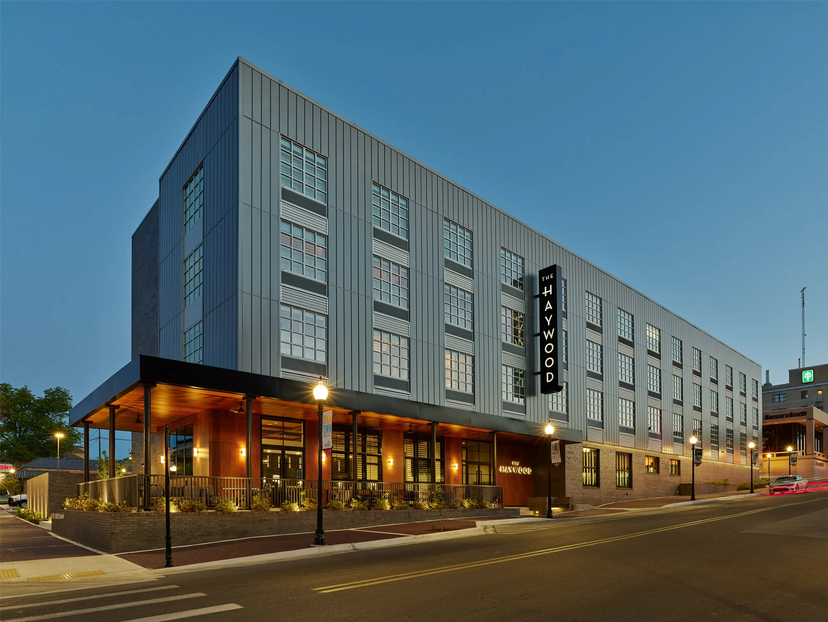 The Haywood is four stories and 70 rooms, a rectangular, metal-clad building with a wraparound, ceiling-fanned front patio, landscaped courtyard and pool, and The Well — a full-service bar of inlaid marble tile, stained wood, sink-down couches and side tables to put your drink on. Or drinks.